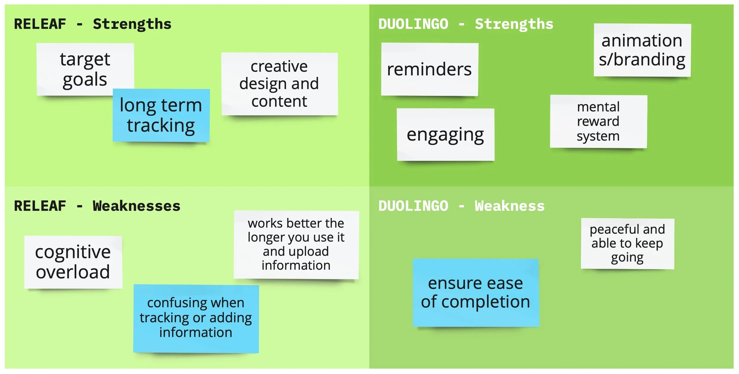I identified the strengths and weaknesses of Releaf and Duolingo with a SWOT chart.