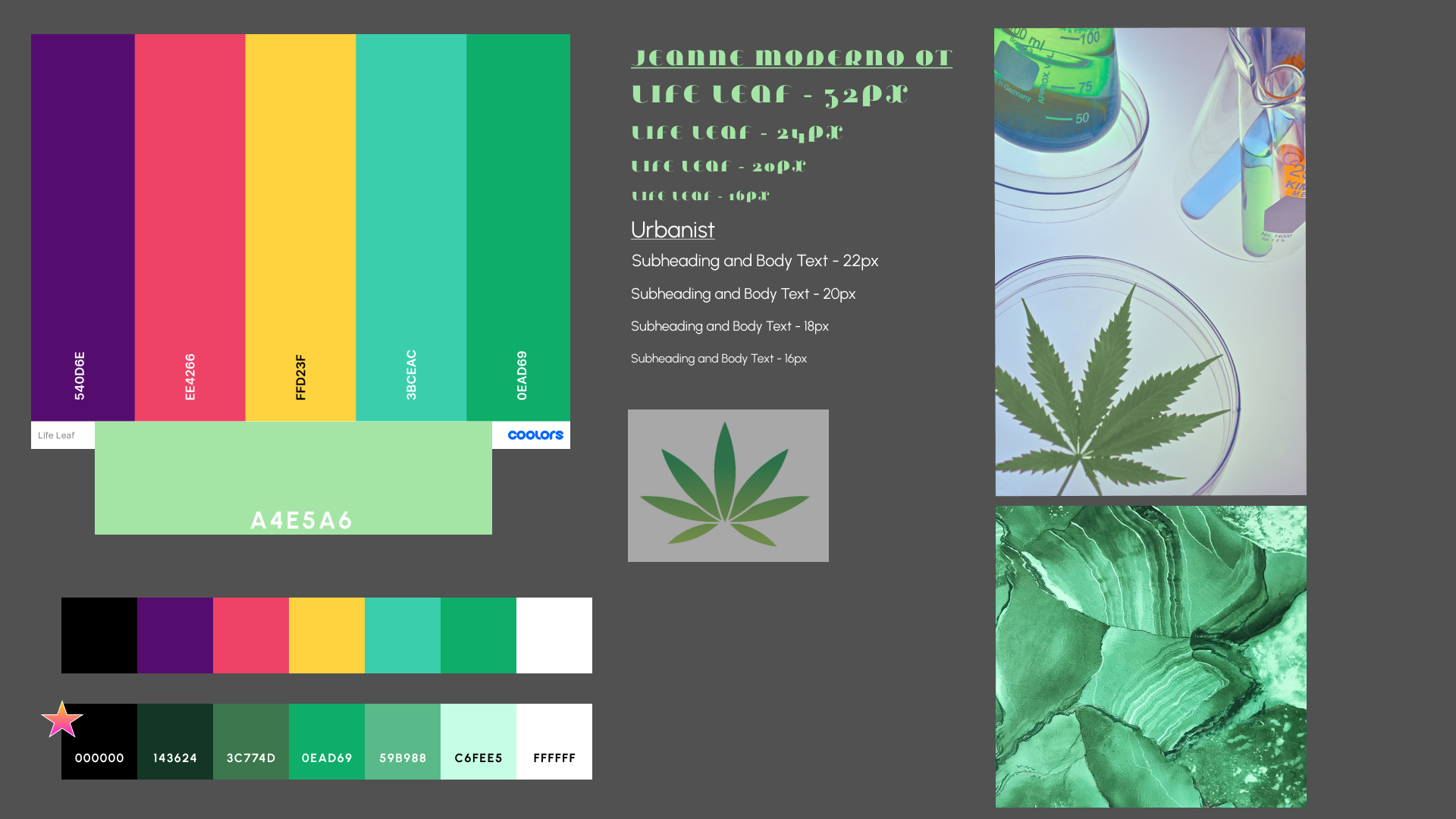 Based on the natural and holistic nature of the app I selected a monochromatic green palette for the brand. The accent colors differed slightly throughout the process as I determined what color combination expressed the calm and sleek tone desired as well as maintained legibility.