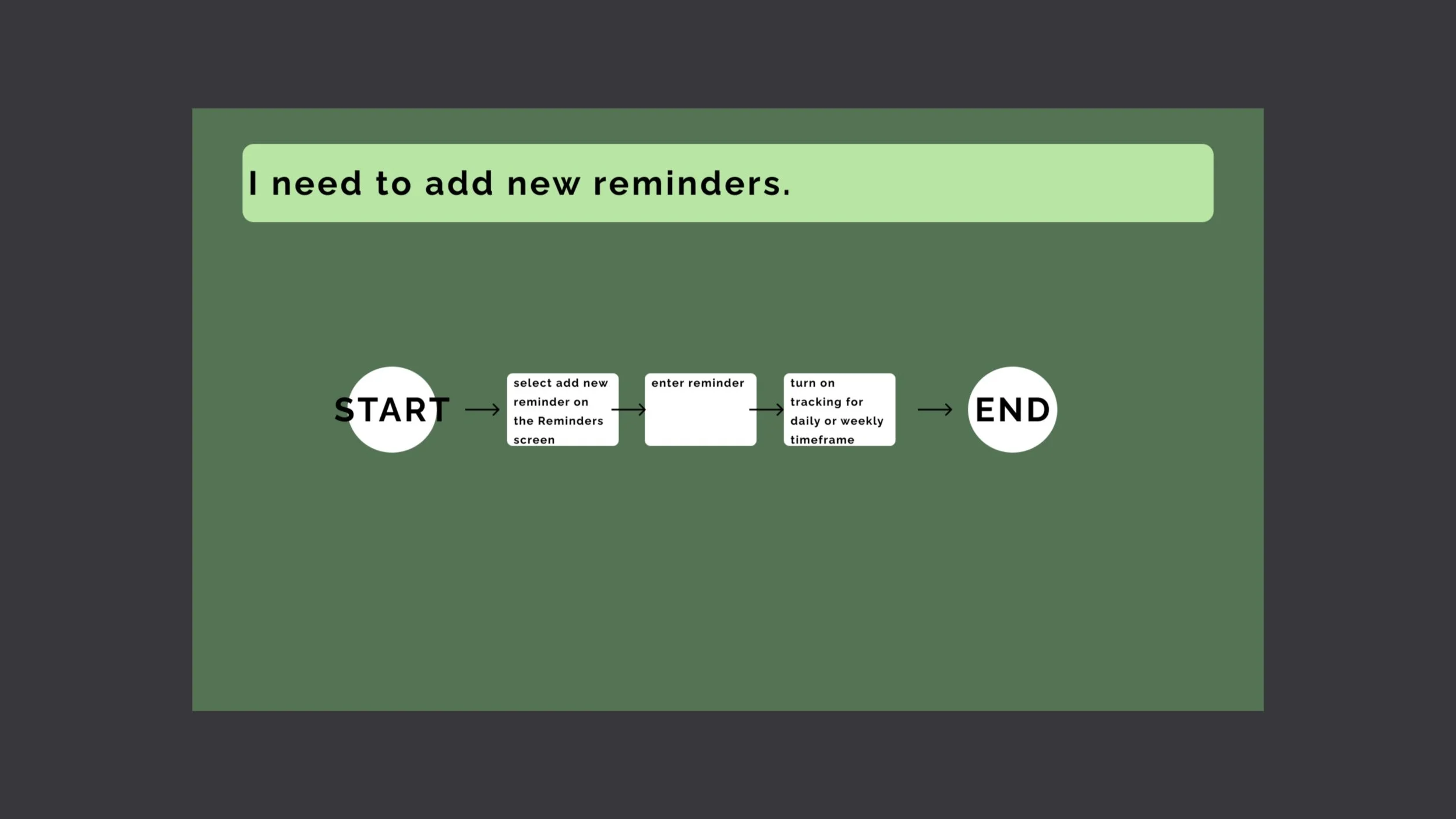 I learned that while every user has completely individual needs and motivations, all users will need to input, monitor, and access their information in a similar manner. The flow of information must be comprehensible and easy for the user to navigate, whether they have a prevalent understanding of medical and mental health.