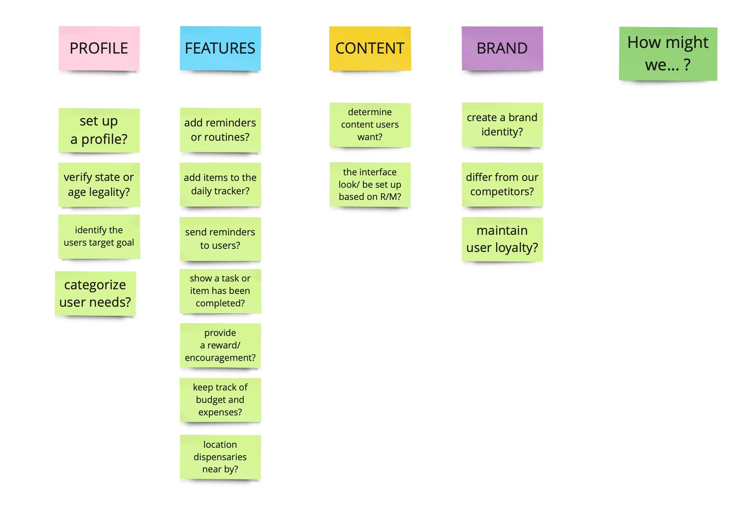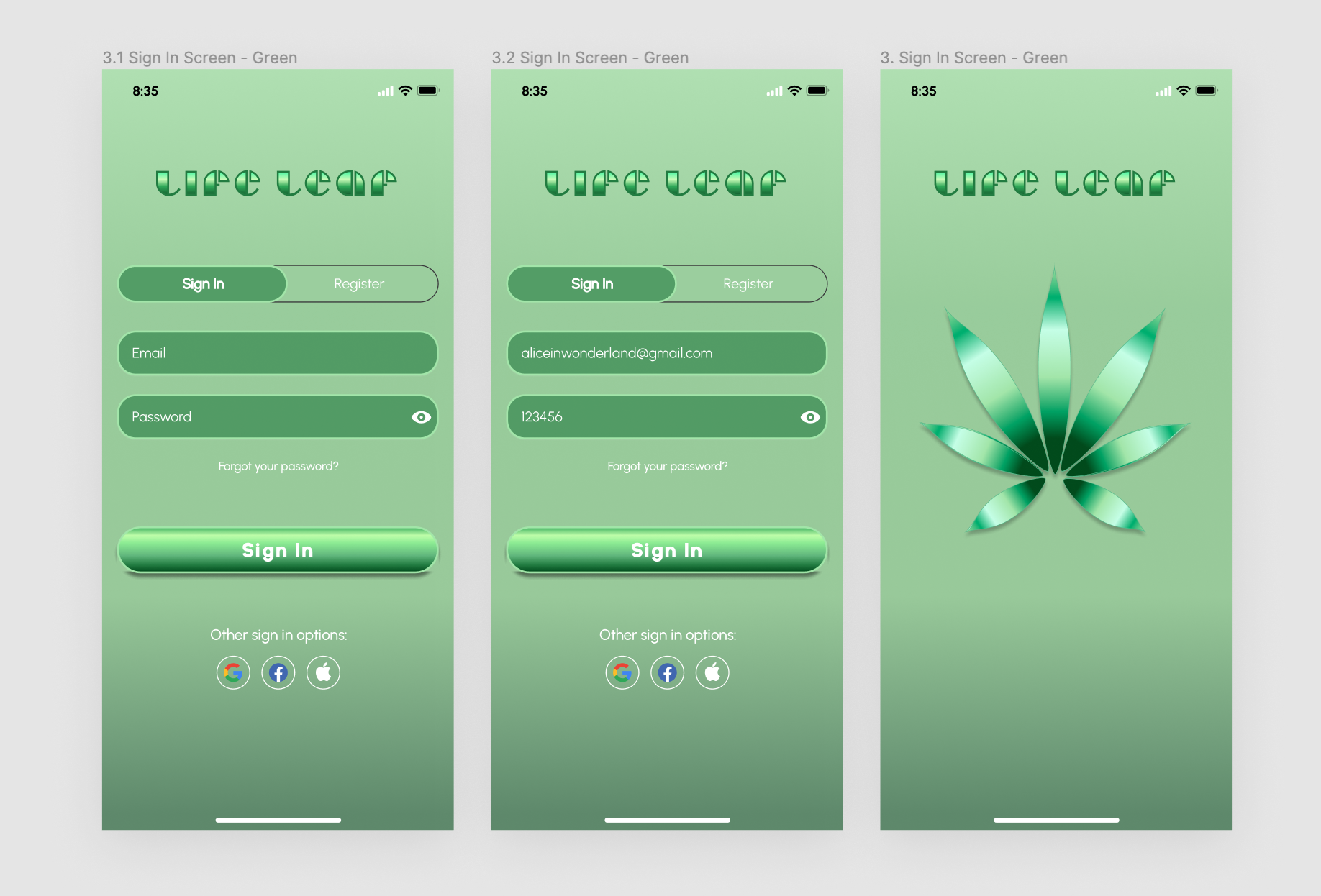 By assessing the design and outcome from the apps currently available on the market (ReLeaf, Calm, Leafly) I was able to see what users have access to and what they may be lacking. I found similarities in the visual design but noticed a few differences in the functional uses of these apps.